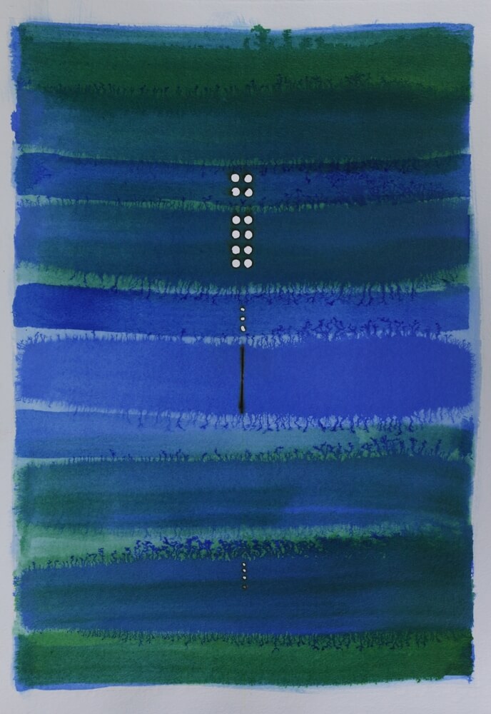 The universe has always been a source of wonder to him and through his masterful strokes of colour, he explores the enigmatic and transcendent nature of the universe. His compositions are characterized by three main elements which breathe life into every piece of this series. First is the daring use of water based colours which is the perfect setting for the second element, which is the vertical line running from the top to bottom representing the cosmic. Last but not the least, is the clever use of perforation and puncturing of the paper within the composition giving his pieces an interesting dimension which resonates with the mysticism. The combination of these three elements adds to the celestial aura of every piece breathing life into each of the compositions. Ashok Gulati’s work reflects his maturity in the expressing structured through the abstract. …