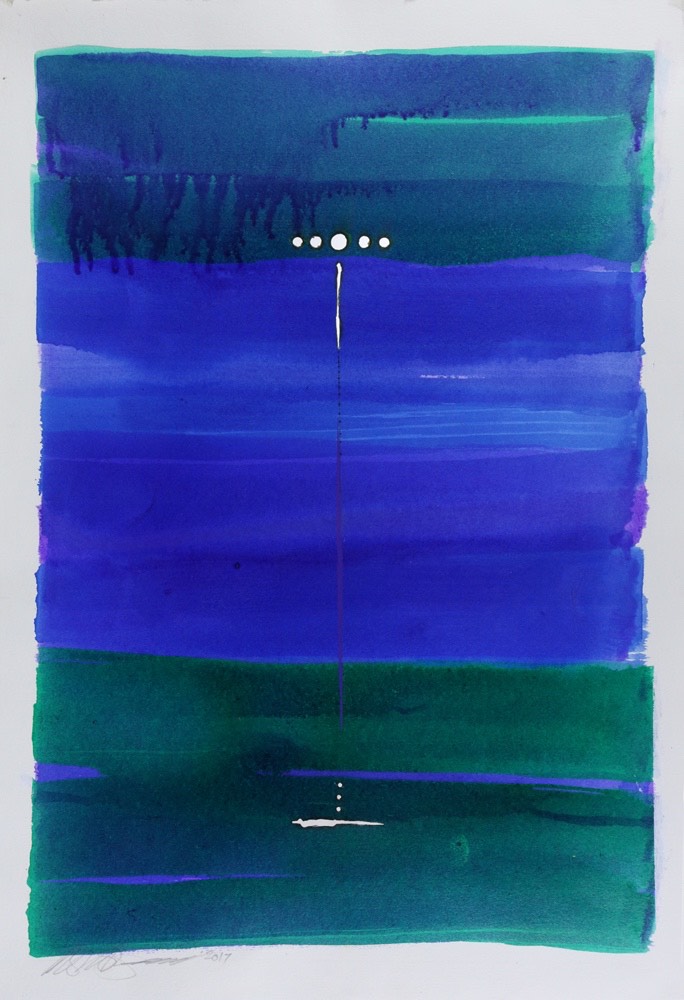 This series of work explores the enigmatic and transcendent nature of the universe. It was amazing to see how Aashok showed the daring use of water-based colours which is the perfect setting for the second element, which is the vertical line running from the top to bottom representing the cosmic. The blue and green colour palette with the clever use of perforation and puncturing of the paper within the composition adds to the ‘mysticism’ giving the paintings a surreal feel.